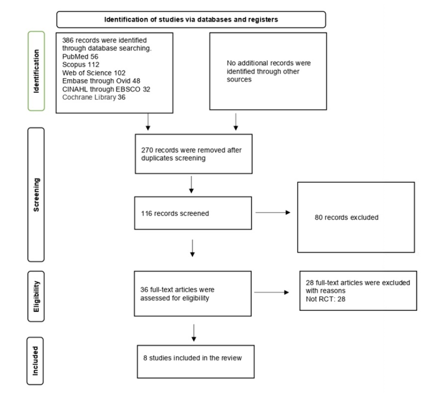 The electronic search yielded 386 records, and after duplication screening, 116 records remained. Based on the inclusion/exclusion criteria, 80 studies were excluded by reading the titles and abstracts, and only 36 articles were eligible for the assessment. The authors studied the full text of 36 articles, of which 28 were excluded based on exclusion criteria, and eight articles with 407 participants were included in the main analysis. The PRISMA flow diagram is presented in Figure-1.