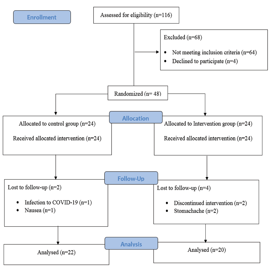 The sample size for this trial was calculated using G*power software (version 3.1.9), which is a widely used statistical power and sample size calculator [14]. A moderate effect size (d=0.5) and a statistical power of 0.85 at a significant level of 0.05 were used to calculate the required sample size. This resulted in a total of 40 patients (20 per group) needed for the study. To account for potential participant dropout, a 20% loss was assumed, leading to a final sample size of 24 patients in the Padzahr group and 24 patients in the placebo group.
