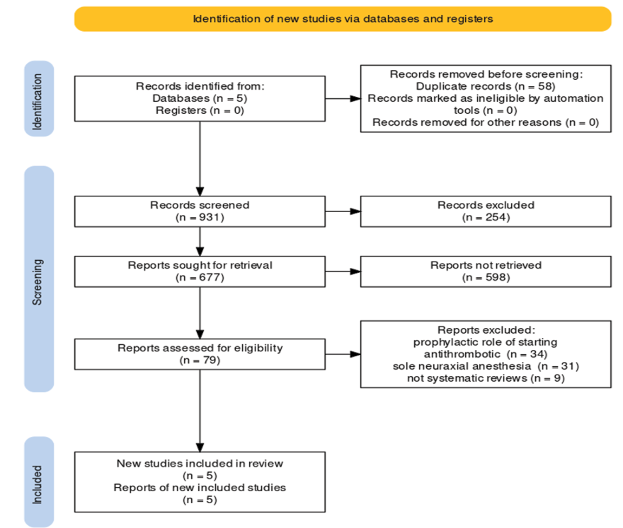 For less potent anticoagulants, there is insufficient evidence, and the management of these conditions depends on the opinion of the anesthetist [12, 13]. Therefore, it is controversial to perform nerve blocks in patients who receive antithrombotic and anticoagulant drugs. The previous systematic reviews are in the form of systematic reviews and panels of experts or clinical guidelines that have addressed various aspects of bleeding complications associated with peripheral nerve blocks in patients taking antithrombotic and anticoagulant drugs, while most of these studies share information for neuraxial blocks. By conducting an umbrella review of systematic studies and meta-analyses, our study seeks to synthesize and analyze the existing evidence to provide insights into the safety profiles of different nerve blocks in the context of anticoagulant use. For this reason, in this research, due to the importance of this issue and the expansion of the use of local and regional anesthesia, a review of systematic review studies about the risks ahead in patients using antithrombotic and antithrombotic drugs was conducted.