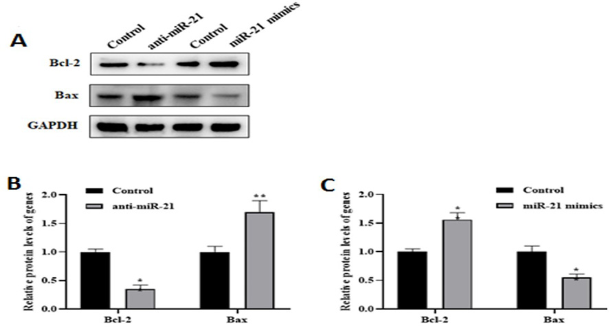 Figure 2. The miR-21 could inhibit the apoptosis of the AD model. Western blot analysis (A) showed the levels of Bcl-2 and Bax in AD model transfected with anti-miR-21 or miR-21 mimics. The result indicated that low expression (B) of miR-21 leads to down- and upregulated Bcl-2 and Bax protein levels, respectively. However, by increased the miR-21 level (C), the pro-apoptotic Bax protein level was reduced compared to the control level. The **P<0.01 vs. control