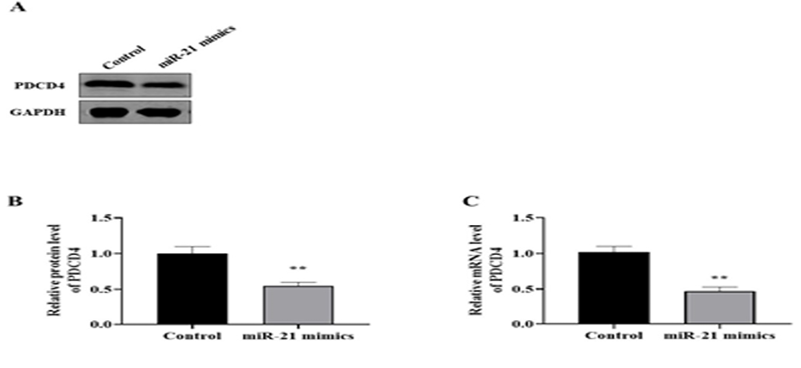Figure 3. The miR-21 negatively regulates PDCD4. Western blot analysis (A and B) indicated PDCD4 protein levels decreased in AD model after miR-21 mimics transfection. Also, qRT-PCR (C) revealed PDCD4 mRNA levels after miR-21 mimics transfection significantly was reduced in AD model compared to the control group. **P<0.01 vs. control