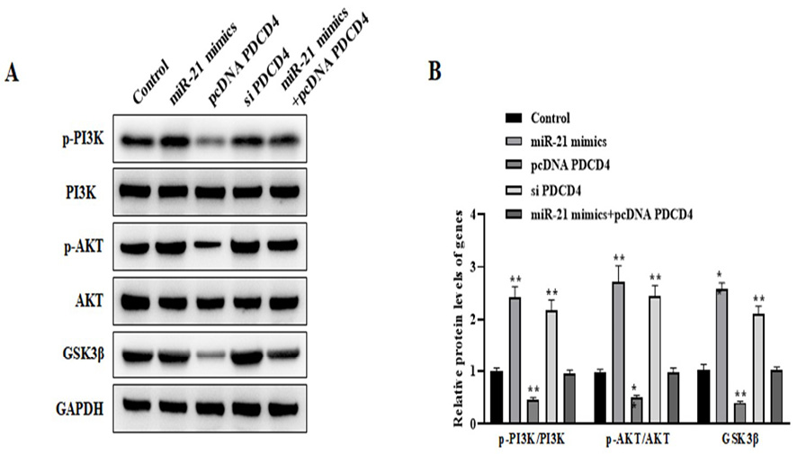 Also, the current study demonstrated that miR-21 overexpression led to increased p-PI3K, p-AKT, and GSK3β protein levels, indicating that miR-21 overexpression promoted the PI3K/AKT/GSK3β signaling. Also, we showed that the activated PI3K/AKT/GSK3β signaling following miR-21 overexpression could reverse after co-transfection of pcDNA PDCD4, which proved that miR-21impact its role via inhibition of PDCD4 expression.