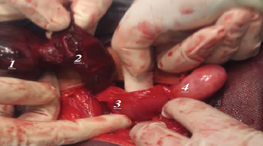 Figure 2. Right adnexal torsion observed during laparotomy on a child presenting with acute-severe and constant abdominal pain. The numbers show (1) right ovary (2) right fallopian tube (3) uterus and (4) left normal ovary.