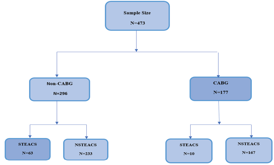 In this study, patients were enrolled through a complete enumeration method. Subsequently, the patients were divided into two groups based on their history of CABG: those with a history of CABG and those without a history of CABG (control group). These two groups were then examined for hospital and long-term cardiovascular complications. ACS in these two patient groups was further categorized into two subgroups: STEACS/primary PCI and NSTEACS/PCI (Figure-1). The sampling was done through a complete enumeration method, and approximately 473 files were collected for analysis.