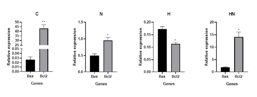 Figure 3. Real-time PCR results. Data obtained from real-time PCR, demonstrated that the expression of Bcl-2 gene at mRNA level was much higher than the Bax gene in the control/untreated sample (C). After treatment of Y79 cells with naringenin Bcl-2 mRNAs expression level was still higher than the Bax gene (N); however, hypericin treated Y79 cells expressed Bcl-2 mRNA less than Bax (H). The expression level of Bcl-2 mRNA was more than the Bax in samples treated with hypericin and naringenin simultaneously (HN).