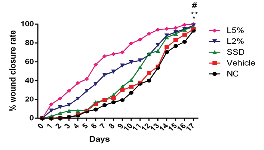 Figure 1. The percent of WCR in rats of all the groups. Findings indicated that luteolin treatment could significantly enhance wound healing compared to negative control (NC) and SSD groups. *P<0.001 vs. NC, **P<0.005 vs. SSD, #P<0.05 vs. L2%