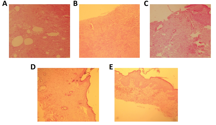 Figure 2. The histopathological findings of rats with second-degree wounds in negative control (A), vehicle (B), SSD (C), and luteolin-treated (D and E) groups (H&E staining, magnification ×200)