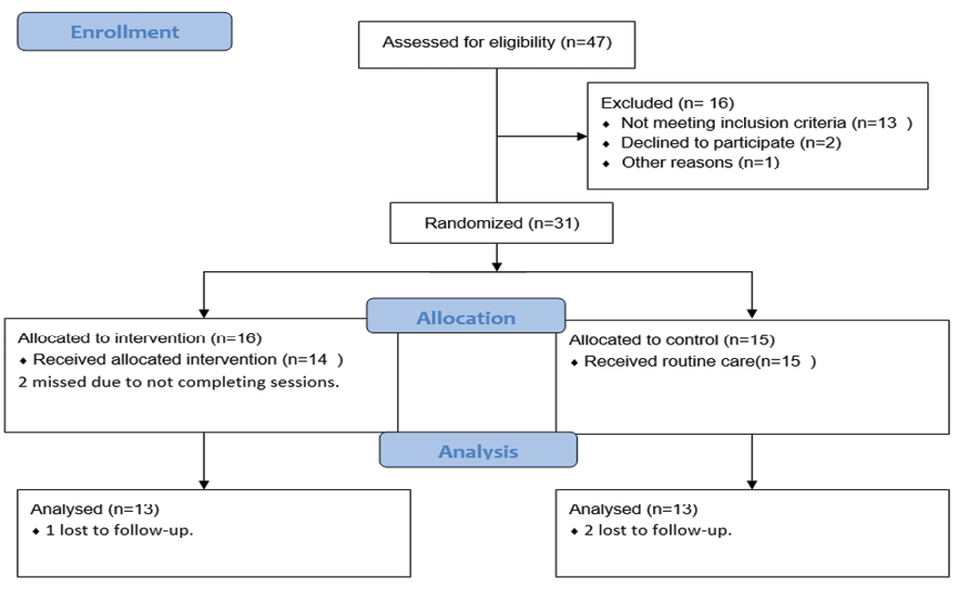 In this study, both intervention and control groups consisted of 13 individuals (as shown in Figure-1). In the CONSORT Flow Diagram (Figure-1), a total of 47 participants were initially assessed for eligibility. Of these, 16 were excluded, with 13 not meeting the inclusion criteria, 2 declining to participate, and 1 for other reasons. Subsequently, 16 participants were allocated to the intervention group, of which 14 received the allocated intervention, while 2 missed sessions. Additionally, 15 participants were allocated to the control group and all received routine care. Upon analysis, 13 participants from both the intervention and control groups were included, with 1 participant lost to follow-up in the intervention group and 2 lost to follow-up in the control group.