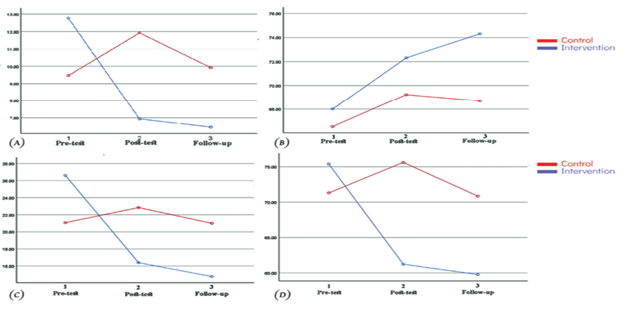 The interaction effect between time and treatment group was statistically significant for distress scores (F=3.024, P=0.048; Figure-2. D). Subsequently, we performed pairwise comparisons to examine the differences among the various testing stages. Our analysis revealed that the discrepancies in distress scores between the pre-intervention and post-intervention assessments (P=0.034) and those between the pre-intervention and follow-up evaluations (P=0.002) were statistically significant. Conversely, no meaningful difference was detected in distress scores between the post-intervention and follow-up periods (P=1.000) (Table-3).