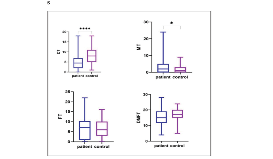 Figure 1. Comparison of the DMFT index between the two groups. In each group, the middle line is equal to the median value of observations. The mean of FT and MT was higher in RA patients however, this difference was statistically significant only for MT. On the other hand, the mean values of DMFT and DT were higher in the control group compared to the patient group.