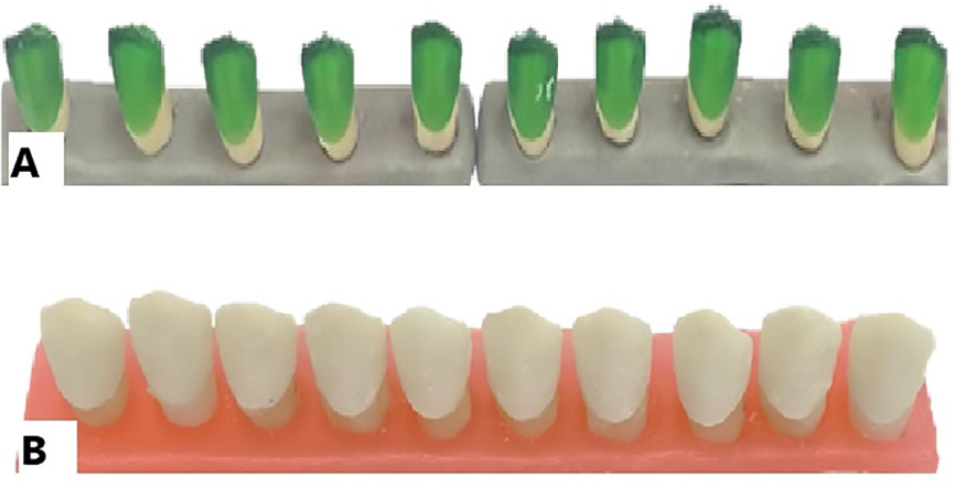 Figure 3. Digital wax-up (Milling) and conventional casting. A, 10 digital wax patterns by print-milling method on 10 resin dies. B, 10 pieces of lithium disilicate coating (IPS Emax press) obtained by milling the wax pattern on 10 pieces of resin dies.