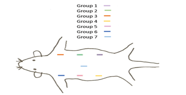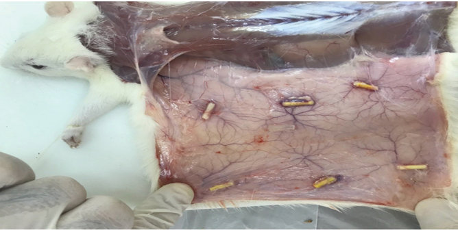 The rats were anesthetized by injection of 0.4 mL/kg ketamine and 0.02 mL/kg xylazine and their back was shaved and disinfected with betadine. Next, 7 separate incisions were made subcutaneously with adequate distance from each other. Polyethylene tubes were filled with the respective materials (controls tubes remained empty) and implanted subcutaneously according to the order shown in Figure-1, and sutured with absorbable chromic catgut suture thread. During the recovery phase, 10% dextrose was injected to rats intraperitoneally.