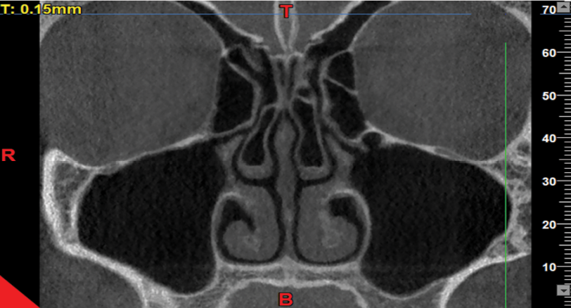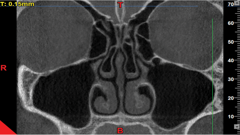 Figure 1. CBCT showing pneumatization of the middle concha. Note the pneumatization and radiolucency in the middle concha, which were detected by scrolling the coronal view.