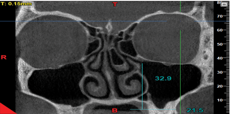 This retrospective cross-sectional study evaluated CBCT scans of 208 patients referred to a private maxillofacial radiology clinic during 2020-2022. The inclusion criteria were optimal quality of images, available information about the age and gender of patients, and complete visualization of the maxillary sinuses and the nasal cavity on the CBCT scans. Patients with a history of surgery, implant placement, bone graft, pathologies, mid-facial trauma, sinusitis, or complete maxillary sinus and ostium obstruction, and patients under 15 years of age were excluded from the study. Most CBCT scans in this radiology department were performed for dental implant planning or diagnosis of maxillofacial pathologies.