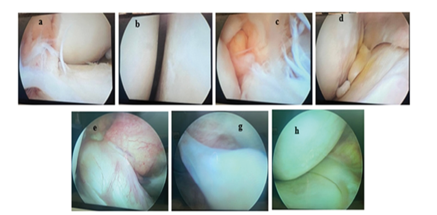 Figure 1. Various findings related to ACL remnant adhesion and associated knee injuries, categorized by specific types of lesions and adhesions. (A and C) ACL remnant not adhered to the PCL. (B) Type 2 condylar lesion on the tibial condyle. (D) Condylar lesion presenting as a lozenge-shaped defect. (E) ACL remnant fully adherent to the PCL. (G) Large tear of the medial meniscus. (H) Type 3 condylar lesion on the femoral condyle.