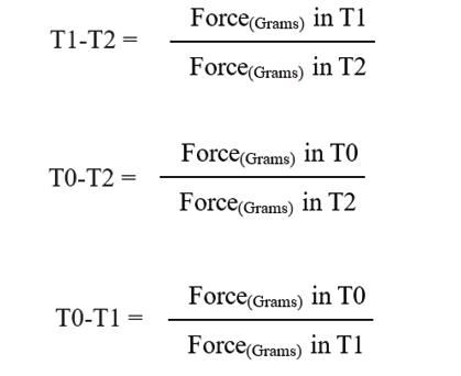 The amount of force required to remove the retainer from the mouth for VFR and Hawley retainers was different because of their different structure and positioning in the mouth and therefore it was not possible to compare them in terms of force. Instead, the amount of force change from one timepoint to another was recorded as a ratio and was then compared between Hawley and VFR retainers to indicate which one witnessed more change over the 6 months. Thus, the change ratio represents how much the retention force of each retainer reduces during 6 months. The retention change index is calculated as follows: