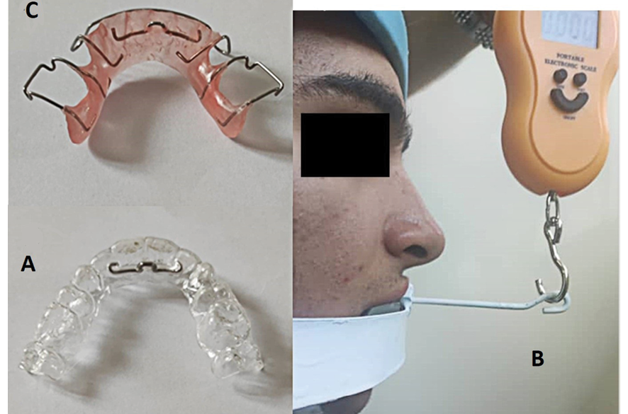The retention force of retainers was assessed according to the amount of force required to remove the retainer from the mouth; in other words, the more force required to remove the retainer, the more retention force the retainer had. To assess this force, patients were asked to place their heads on the head holder to maintain their heads in a static and completely horizontal position. Next, the force was applied via a force gauge through a hooked lever on the head holder to pull out the retainer (Figure-1B). The minimum force by which the retainer was removed from the mouth was recorded in grams. To prevent damage to the lower anterior teeth, a mouth guard was placed for them. In all patients, the head holder was positioned in alignment with their occlusal plane and was connected to their retainers through the holes that were designed in the retainers. All patients were evaluated at three timepoints: On the retainer delivery day (T0), 3 months after delivery (T1), and 6 months after delivery (T2).
