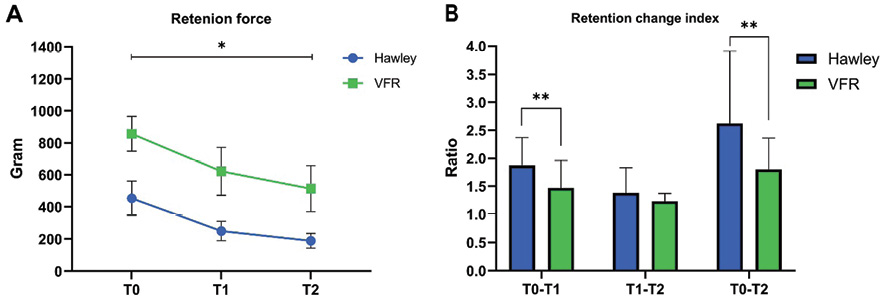Figure 2. A) The amount of force (in grams) required to remove the retainers from the mouth in T0, T1 and T2. B) The ratio of change in retainers’ retention force from one timepoint to another (T0-T1, T1-T2 and T0-T2). Data are presented in Mean ± SD. VFR: Vacuum-formed retainer. T0: immediately after retainer delivery; T1: 3 months after delivery; T2: 6 months after delivery. *: Mean differences throughout T0, T1 and T2 are statistically significant (Repeated measure ANOVA; P-value < 0.001 for both Hawley and VFR). **: Mean differences between Hawley and VFR are statistically significant (Two-tailed T test; P-value = 0.015 for T0-T1; P-value = 0.013 for T0-T2).
