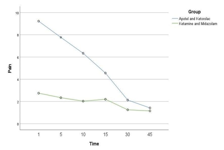 On the other hand, the interaction of time and groups were significant; accordingly, the severity of the pain decreased over time. The mean difference in pain at times one, five, ten, fifteen, thirty, and forty-five in the Ketamine+Midazolam group was 5.43 (SD: 0.93), 4.98(SD: 1.27), 4.41(SD: 1.34), 3.84(SD: 1.67), 2.13(SD: 1.93), and 0.42(SD: 1.91) less than Acetaminophen+Ketorolac group. Overall, the mean pain score was higher in the Acetaminophen+Ketorolac than the Ketamine+Midazolam group at all post-intervention time points (Table-3). Nevertheless, the pain intensity significantly and consecutively reduced in both groups during the study (Figure-2).