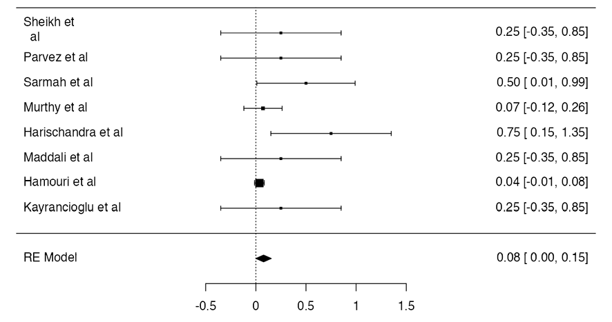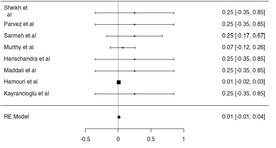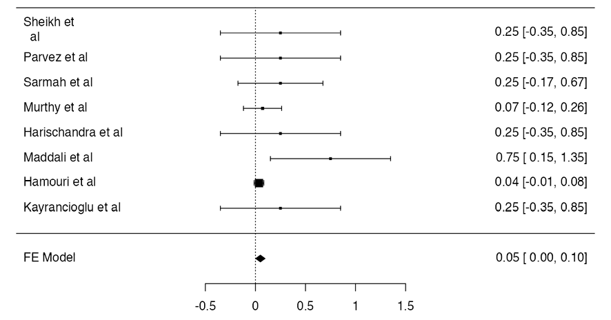 Figure 7. Meta analysis of proportion of postoperative intubation rate (1.4%)