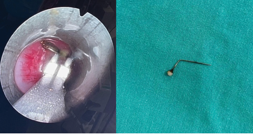 Figure 2. Intraoperative view during bronchoscopy and curved pin after removal
