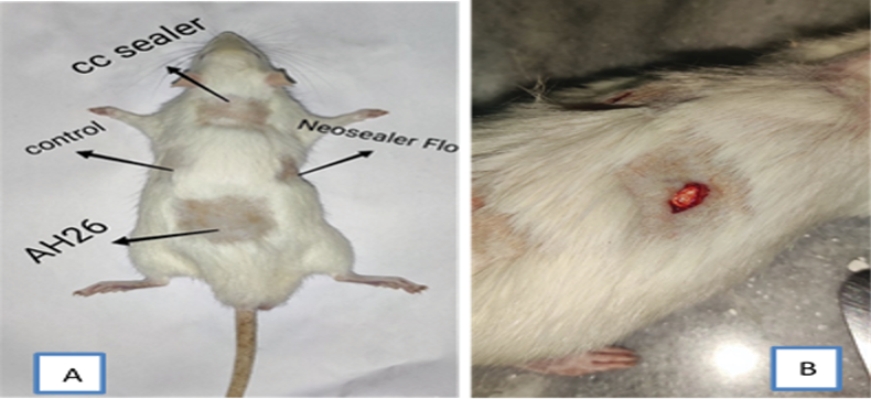 Figure 1. The back of the rat (A) Surgical sites of sealers (B)surgical incision and implanted sealer