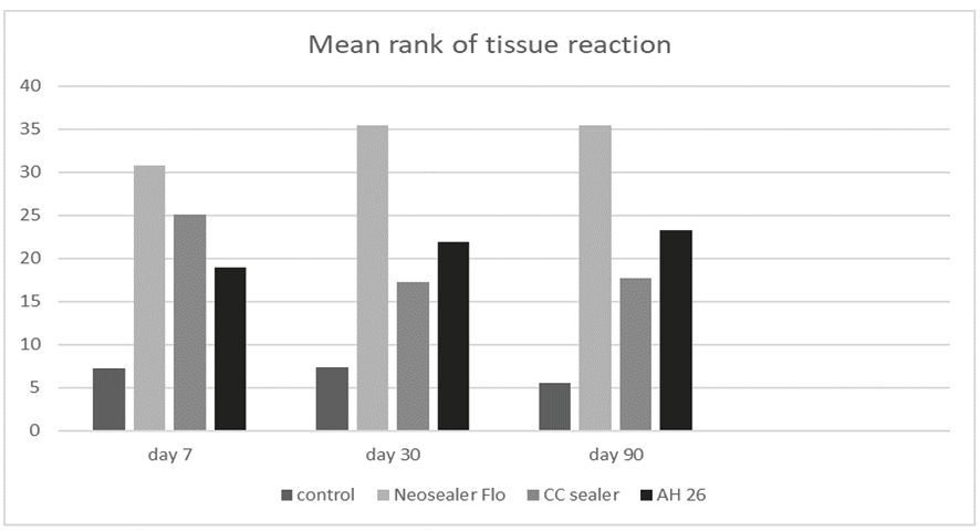 Tissue reaction is a combination of the Extent of inflammation, the severity of inflammation, and angiogenesis criteria. Significant differences were noted in tissue reaction among the four groups at 7 days, 30 days, and 90 days (P<0.001 for all). The lowest tissue reaction was noted in the control group and the highest in the NSF group (Figure-2). On day seven, the tissue reaction was the highest in the NSF, followed by the CC Sealer, and AH26 group. The differences between AH26 and CC Sealer, and also CC Sealer and NSF were not significant. However, the difference between AH26 and NSF was significant. On day 30, tissue reaction was the highest in the NSF, followed by AH26 and then CC Sealer group. The difference between AH26 and CC Sealer was not significant (P>0.05). However, the differences between AH26 and CC Sealer, and AH26 and NSF were significant. On day 90, tissue reaction was the highest in the NSF, and equal in AH26 and CC Sealer groups. AH26 and CC Sealer had a significant difference with NSF in this regard.