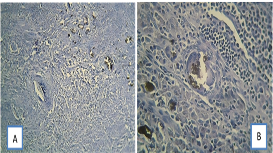 Figure 3. (A) subcutaneous tissue reaction to NSF on day 90. Foreign body reaction against the implanted material (brown material) can be seen. x100 magnification. (B) subcutaneous tissue reaction to NSF on day 90. Infiltration of mononuclear cells, plasma cells, and giant cells, and foreign body reaction to brown material can be seen. x400 magnification, H & E staining.