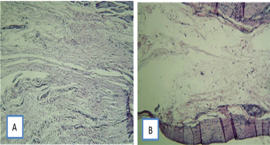 Figure 4. Tissue reactions on day 90: (A) subcutaneous tissue reaction to CC Sealer; No sign of inflammation can be seen. Collagen fibers are formed, and fibroblasts are mature. The connective tissue has low cellularity.