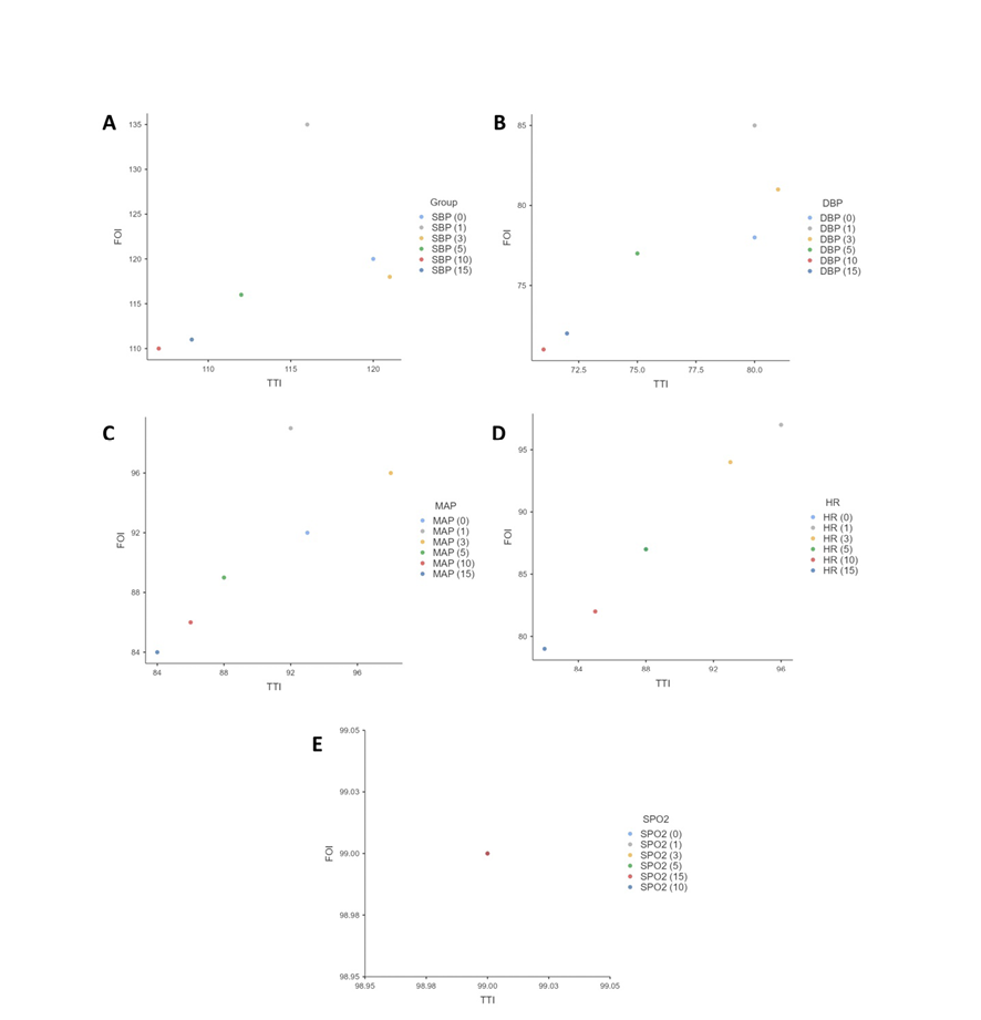Figure 1. Scatter plots of average systolic blood pressure (A), diastolic blood pressure (B), mean arterial pressure (C), heart rate (D) and SpO2 (E) across different time-points in tracheal tube intubation (TTI) and fiberoptic intubation (FOI) groups.