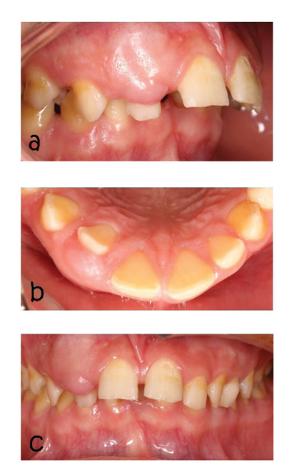 Figure 1. a: Intraoral photograph (lateral view), b: Intraoral photograph occlusal view showing shift lateral incisor palatal aspect ,c: Intraoral photograph with obliteration vestibular