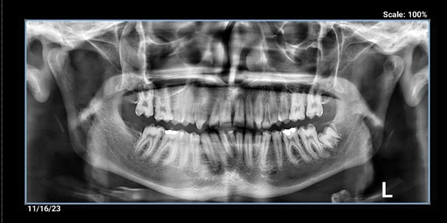 Figure 2. OPG showing a round oval radiolucency around UR2 root