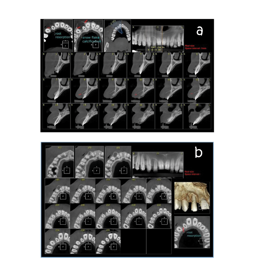 Figure 3. a: CBCT axial view showing root resorption and snow flake calcification, b: CBCT cross sectional view showing bone expantion and root resorption