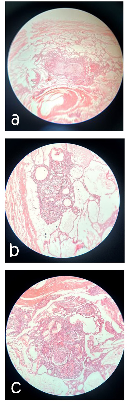 Figure 5. a: Histopathologic sections with hematoxylin-eosin stained demonstrating a tumor with a thickcapsule. (H and E × 4), b: Duct-like spaces that be polarized away from central space are surrounded by cuboidal to columnar cells. (HE × 10), c: irregular calcified areas with eosinophilic material.(H and E × 10
