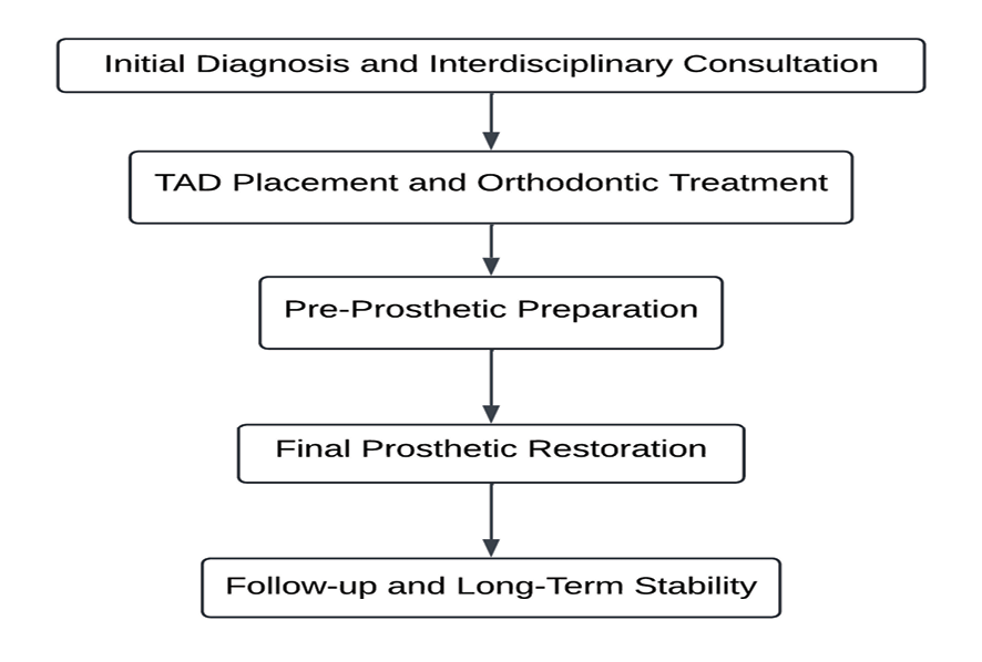The integration of TADs into combined orthodontic-prosthetic treatments requires a well-coordinated approach, with treatment protocols that emphasize interdisciplinary planning. Figure-2 illustrates the approach to treatment planning, including orthodontic corrections followed by prosthetic interventions, with TADs as the anchor [7].