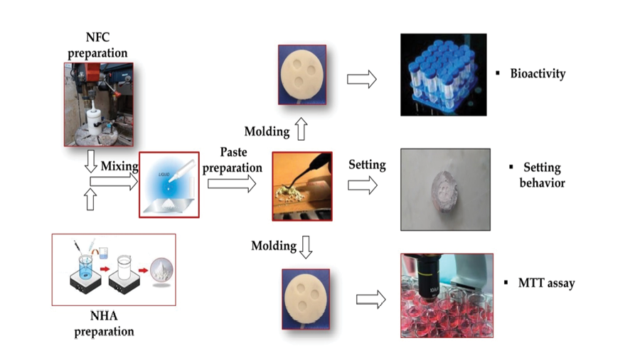 Hydroxyapatite can serve as a scaffold for new bone formation and can enhance capillary [21], perivascular [22], and osteogenic cell growth in the recipient area [23]. An essential quality of retrofilling cement is its bioactivity [13], which enables the creation of a solid attachment to living tissue by producing a layer of hydroxyapatite [24-27]. However, the fundamental requirement for a material implanted in the human body is its biocompatibility [28]. The addition of hydroxyapatite to root canal sealers, dental materials, and tooth glues serves to reinforce them and enhance their effectiveness and biological response [29, 30]. NHA is a potential addition with attributes such as biocompatibility, bioactivity, and osteoconductivity [31, 32], making it a promising additive that could enhance the properties of NFC. This study seeks to determine the effects of integrating NHA with NFC in order to improve its biocompatibility, bioactivity, and antibacterial functions.