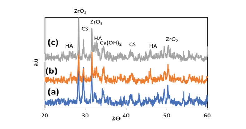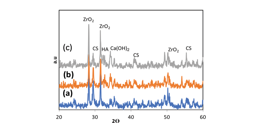 In the present study, Figure-2 depicts the XRD patterns of NHA powder, exhibiting the characteristic peaks of hydroxyapatite and indicating the absence of impurities in the produced hydroxyapatite powder. Furthermore, Figure-3 displays the transmission electron microscopy images of the synthesized hydroxyapatite powder, revealing that the hydroxyapatite nanoparticles measure between 20 and 50 nm in size. This powder was utilized in the fabrication of a calcium silicate nanocomposite containing hydroxyapatite, and its impact on NFC properties was examined. Figure-4 displays the X-ray diffraction (XRD) patterns for NFCH0, NFCH10, and NFCH20.These patterns are consistent with the samples before their exposure to the simulated body fluid (SBF) solution. In Table-3, the significant peaks corresponding to the different compounds can be observed. The primary components of NFC consist of tricalcium silicate (C3S), dicalcium silicate (C2S), tricalcium aluminate (C3A), along with zirconium oxide. The addition of water results in a slight reduction of tricalcium silicate and dicalcium silicate, while it leads to the formation of calcium silicate hydrate (C-S-H) and calcium hydroxide (Ca (OH)2). The spectrum exhibits an additional peak in the NFCH10 and NFCH20 specimens at 31.7 and 32.5°, respectively. These peaks correspond to the hydroxyapatite, which was incorporated at 10 and 20 weight percent into NFC to enhance the cement’s bioactivity properties Table-3. Figure-5 displays the SEM images of the NFCH0 and NFCH20 samples, revealing fine particles dispersed on the CSH surface. Examination of the X-ray energy distribution of these particles indicates that they consist of hydroxyapatite. Calcium and phosphorus were found in the X-ray analysis of the material, attributed to the presence of apatite in the NFC.