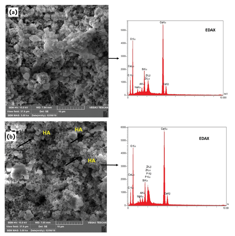 The D-50 diffractometer Siemens model was used to determine the X-ray diffraction patterns, employing Cu-ka radiation with a 1.5 A wavelength in the 2θ range of 20°- 60°. By employing JCPDS reference cards and Xpert high score software, we detected various patterns. A TESCAN-Vega 3 scanning electron microscope (SEM) was utilized to analyze the surface characteristics of samples before and after being submerged in SBF. To boost the efficiency of electricity conduction, a slim coating of carbon was added to the samples. The analysis of the samples was conducted with a scanning electron microscope, operating at a voltage of 15 kV.