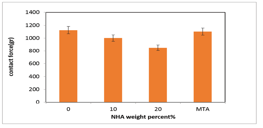 The handling properties were assessed by measuring the maximum contact force needed to compress prepared pastes using a 5 mm diameter probe to a depth of 4 mm. Figure-7 compares the contact force of samples prepared with 0, 10, and 20 wt% NHA. The figure indicates that the contact force decreases for samples containing 10 and 20 wt% NHA in the NFC paste. Specifically, the contact force for the sample with 0 wt% NHA (NFC0) is 1123 gr, which decreases to 800 gr when 20 wt% NHA is used in the NFC20. The demand for advanced dental materials has led to the exploration of nanocomposites, which offer enhanced mechanical properties and bioactivity. Understanding the thermal behavior of these materials under various conditions is crucial for their application in dentistry [41-46].
