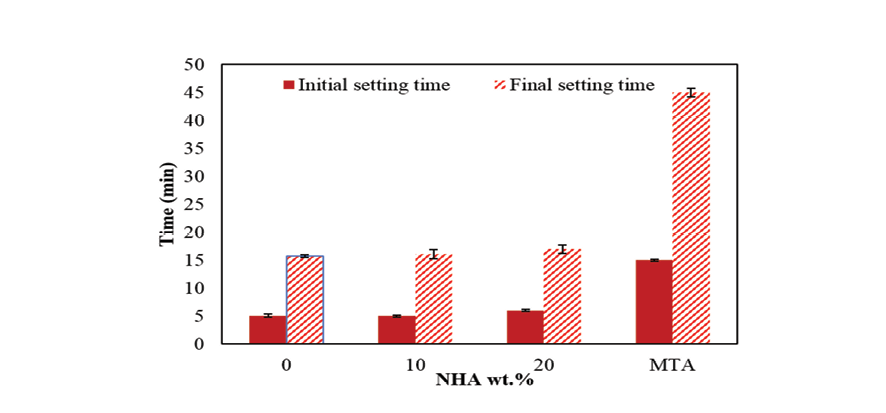 The NFC consists of hydrophilic particles that solidify upon exposure to moisture [15]. This substance offers an alternative to MTA, which has a lengthy setting time that is not ideal for clinical use [39]. The setting characteristics of NFC are examined in this section, including the influence of adding NHA on the setting time. The structure and hydration of NFC result from a series of intricate reactions. The starting and finishing times for each of the different mixtures are displayed in Figure-6. The initial setting time for NFCH0 was approximately 5 minutes, with a final setting time of 15.75 minutes. MTA is a widely used dental sealer, with a setting time of 2-3 hours, The speed is considerably slow, which can result in various health concerns [40]. The findings indicate that by using pure NFC, the setting time can be reduced by 7.5-11 times compared to MTA.The rise in the amount of NHA results in a minimal change in the initial and final setting times of NFC, as depicted in Figure-6. Hydroxyapatite nanoparticles, which are calcium phosphate, do not disrupt hydration reactions and therefore have little impact on the setting time. Any slight increase in setting time may have been influenced by the powder/liquid ratio, given that samples containing NHA required a greater amount of water to achieve a suitable consistency for clinical purposes, consequently leading to an increase in the setting timeb [41-46].