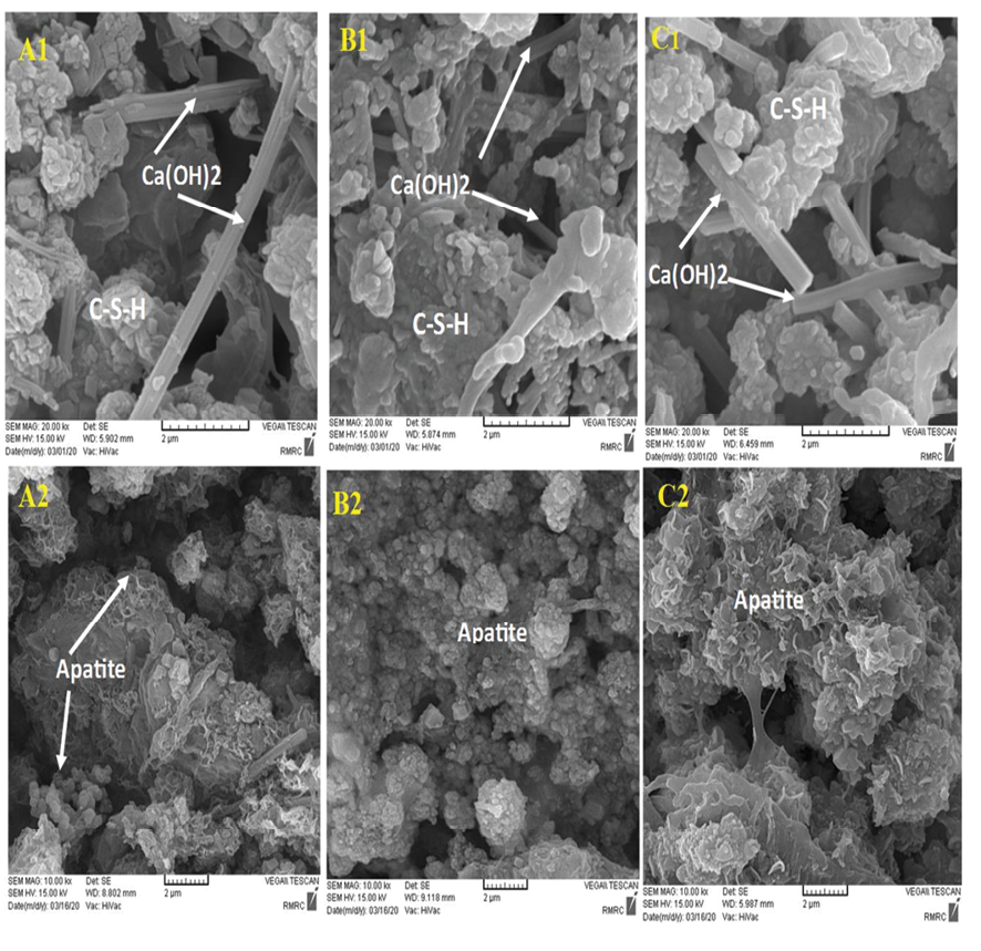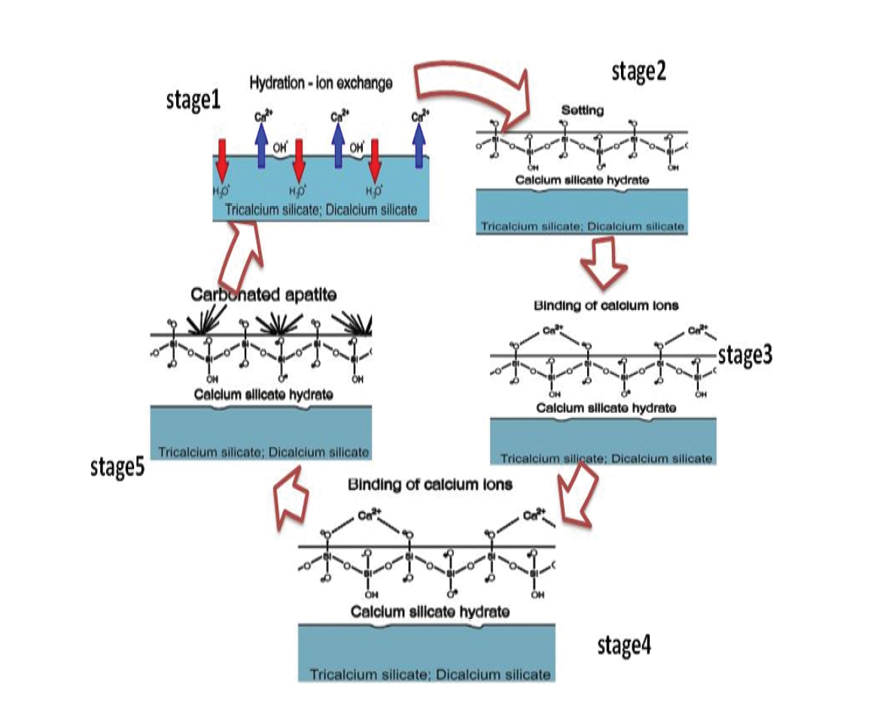 The addition of calcium silicate to a phosphate-rich solution, referred to as SBF, that has disassembled HPO42- promotes interactions between HPO42- and Ca2+ on the surfaces of the cement. As a result of this process, apatite is formed unevenly (stage5) [58]: