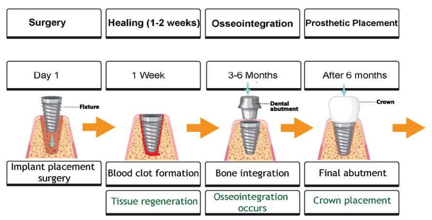 Figure 1. Timeline for the physiological processes involved in dental implant healing and osseointegration. Immediately after implant placement, a blood clot forms at the surgical site (Day 0), initiating the early inflammatory phase (Days 1-7). During this phase, immune cells such as neutrophils and macrophages clear the area of debris and begin the repair process. By the second week (Days 7-14), fibroblasts and osteoblasts begin to proliferate, laying down new connective tissue and bone matrix. The formation of early woven bone occurs around Week 4, providing initial stability. Over the next few months (Weeks 6-12), bone remodeling continues as osteoclasts resorb damaged bone while osteoblasts form mature lamellar bone, gradually enhancing the stability of the implant. Full osseointegration, where the implant is securely anchored to the surrounding bone, typically occurs between 3 to 6 months, depending on patient factors such as bone quality and health.