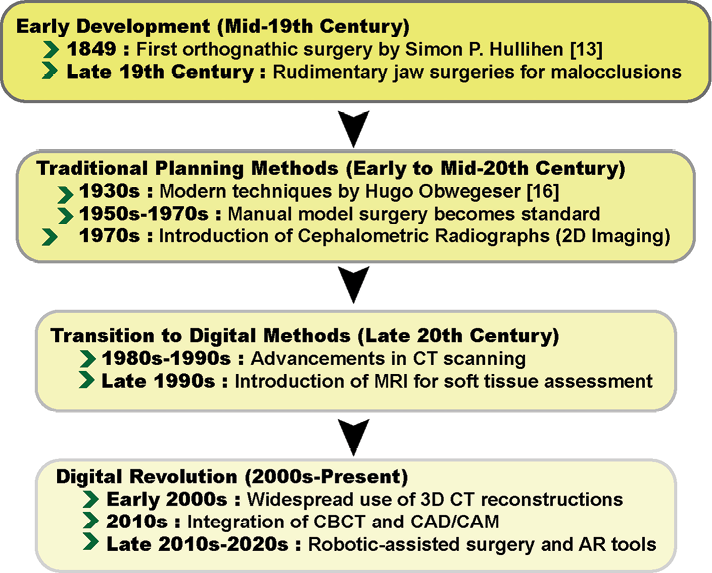 Orthognathic surgery, derived from the Greek terms "orthos" (meaning straight) and "gnathos" (meaning jaw), has experienced considerable evolution since its inception [12]. This specialized field has advanced significantly due to the continuous development of surgical techniques, imaging technologies, and treatment planning methods [13]. While initially dependent on manual and analog approaches, the field has seen a substantial shift towards digital technologies in recent decades, transforming both the planning and execution of surgical procedures (Figure-1) [8]. illustrates the key milestones in the evolution of orthognathic surgery.