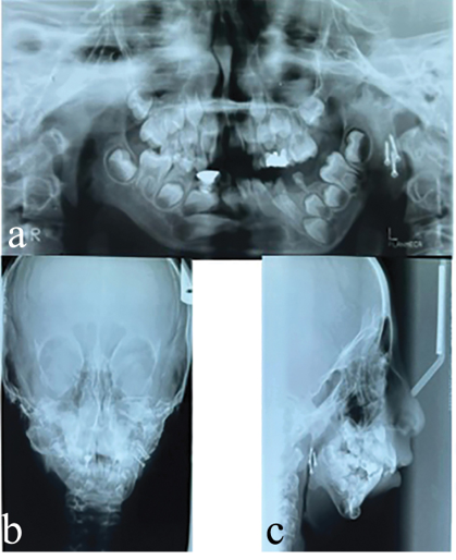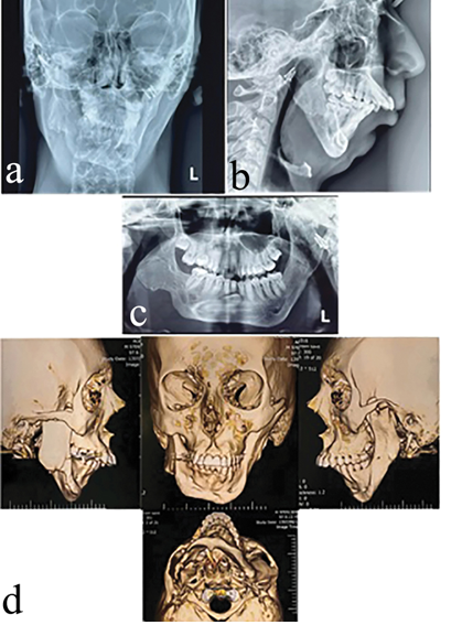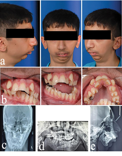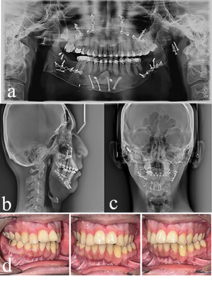 Abstract This case report presents the management of a patient suffering from severe facial asymmetry and malocclusion. The patient was born in 2001 and was later hospitalized due to severe jaundice. At 5 years of age, the deviation in the jaws and the post condylectomy ankylosis of the TMJ and hip joint problems were evident. At age 7, a costochondral graft was performed. In the next phase, orthodontic treatment was started with hybrid functional therapy, but the treatment was unsuccessful due to the severity of the problem. At age 15, bilateral distraction osteogenesis was performed. The orthodontic plan for the maxilla was non-extraction. We expanded the upper arch and corrected the crossbite of the lateral incisors. Due to the difficulty of surgery, the impacted canine of the mandible remained impacted. The mandibular right lower incisor was removed due to severe crowding. Orthognathic surgery was performed after fixed orthodontic treatment. [GMJ.2024;13:e3675] DOI:3675 Keywords: Distraction Osteogenesis; Infection; Orthognathic Surgery; Temporomandibular Joint Ankylosis |