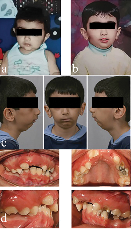 Extraoral examinations revealed facial asymmetry with mandibular deviation in opening to the left, mandibular retrognathism, and barely noticeable facial elongation on the healthy side. TMJ examination revealed limited mouth opening—interincisal mouth opening was 6 mm—markedly limited external and lateral protrusive movements, and deviation of the mandible to the affected side after opening. The amount of overjet before the treatment was 9 mm. A panoramic view showed that the child had all permanent teeth, but the canine tooth on the right side of the mandible was in a horizontal and inappropriate position.
