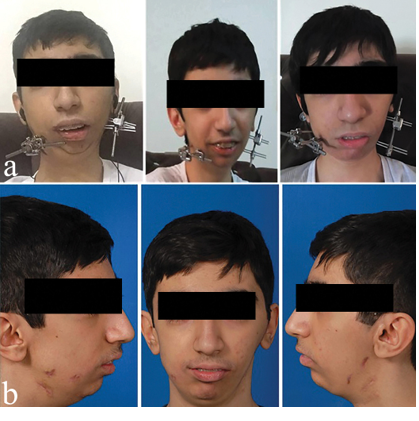 After condylectomy, the patient was referred to an orthodontist for further treatment, and treatment was initiated with a hybrid functional appliance. The functional appliance encourages growth on the deviated side and prevents the formation of the cant of the occlusal plane. Unfortunately, the patient did not respond to treatment due to the severity of the problem (Figure 3). At age 15, asymmetric bilateral distraction osteogenesis was performed for the patient to reduce the discrepancy and jaw movements during surgery. Second molars of mandible were lost due to the DO procedure.