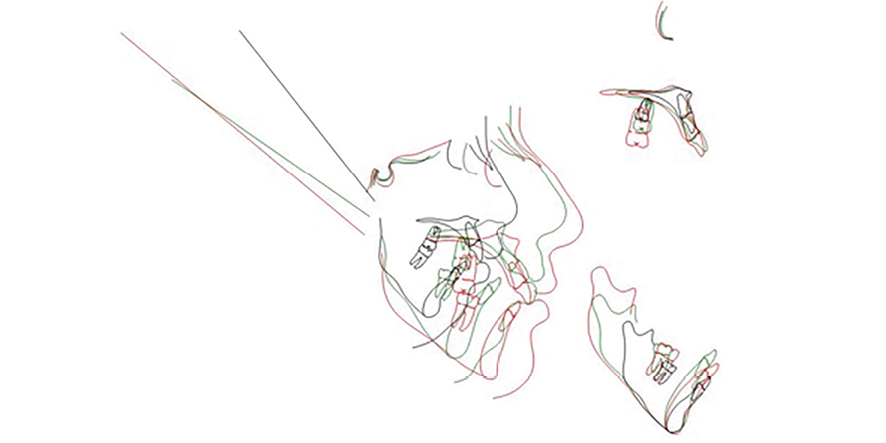 As shown on radiographic images, the lower right canine tooth is impacted. Due to its horizontal position, it cannot be returned to its normal position due to the risks and injuries during surgery. The canine tooth remained in that position. Considering the severity of mandibular crowding, the mandibular right lower incisor was removed. During the fixed orthodontic treatment of the lower jaw, to prevent the resorption of the roots of the anterior teeth, they were not engaged, and arch coordination was performed. Finally, bimaxillary surgery was performed for the patient at 22 years of age. At the end of the treatment, the maximum mouth opening was 13 mm and overjet and overbite were 3 mm. Table-1 presents the results of cephalometric analyses. Figure 6 shows the results of the treatment. Figure 7 is a comparison between the periods before and after treatment. Figure 8 shows the superimposition of the patient at 7, 15, and 22 years of age based on cranial base adaptation. The patient was referred for the replacement of mandibular second molar with implants.