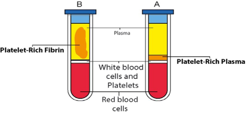 Figure 2. Comparison of PRP and PRF preparations in centrifuged blood samples. Tube A (PRP): This tube contains anticoagulated material. It depicts the separation of blood components after centrifugation to obtain Platelet-Rich Plasma (PRP). Tube B (PRF): This tube does not contain anticoagulated material. It shows the preparation of Platelet-Rich Fibrin (PRF), where a fibrin clot is formed instead of a liquid plasma component.