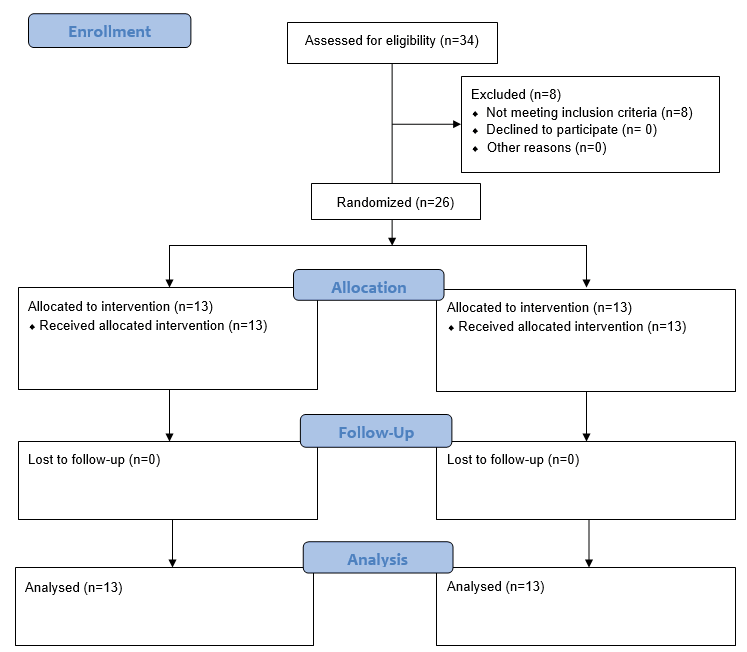 The study included a total of 26 participants (13 in conventional and 13 in laser group) with no lost to follow-up (Figure-3), consisting of 19 women (73.1%) and 7 men (26.9%).