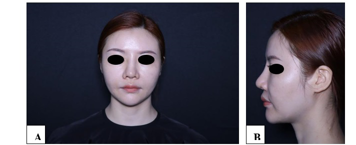Figure 6. One-month postoperative front view (A) and profile view (B) after the fourth surgery.
